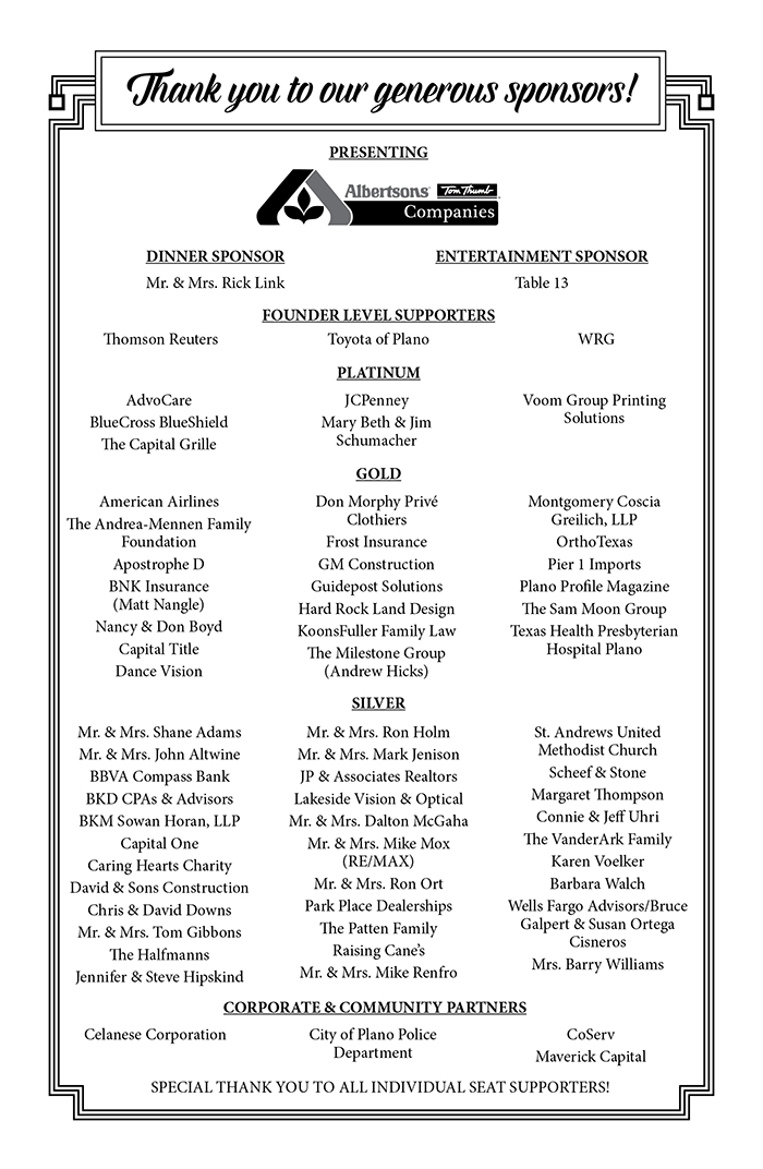 Sponsors because it's important for everyone to know the terrific foundations & businesses that support local nonprofits in their community: Pat Lobb's Toyota of McKinney; The Andrea-Mennen Family Foundation; Thomson Reuters; The Webb Impact Foundation; Dallas Morning News Charities; The Dallas Stars Foundation; Blue Cross Blue Shield of TX; BRY-JO; Closets By Design; Don Morphy Custom Designs; JCPenney; JP & Associates Realtors; Mash'd, TruFire; Sharp Real Estate Group; Voom Printing Solutions; Vpay; Yellow Rose Landscape Services; Nancy Boyd; Frost Bank; GM Construction; Hard Rock Land Design; Kaston Group; Table 13; Texas Health Presbyterian Hospital of Plano; Active Granite; David & Sons; Good Contractors List; Local Profile Magazine; Raising Cane's; Thomas Title. And, thank you to the numerous generous individuals who sponsored a table or purchased seats.
