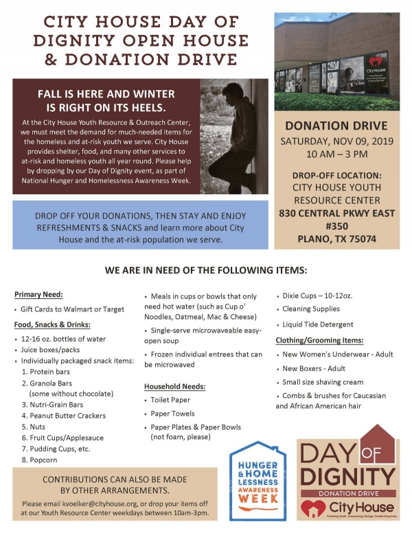 Due to limitation in storage space, we are only accepting specific items listed above. If you are interested in doing a Donation Drive on behalf of City House, please call the Administration Office to discuss our current needs and the donation procedure. Perishable items should be delivered directly to the Children’s shelter, My Friend’s House. All other donations should be delivered to our Administrative Office, at 830 Central Parkway East, Suite #350, Plano, TX 75074.